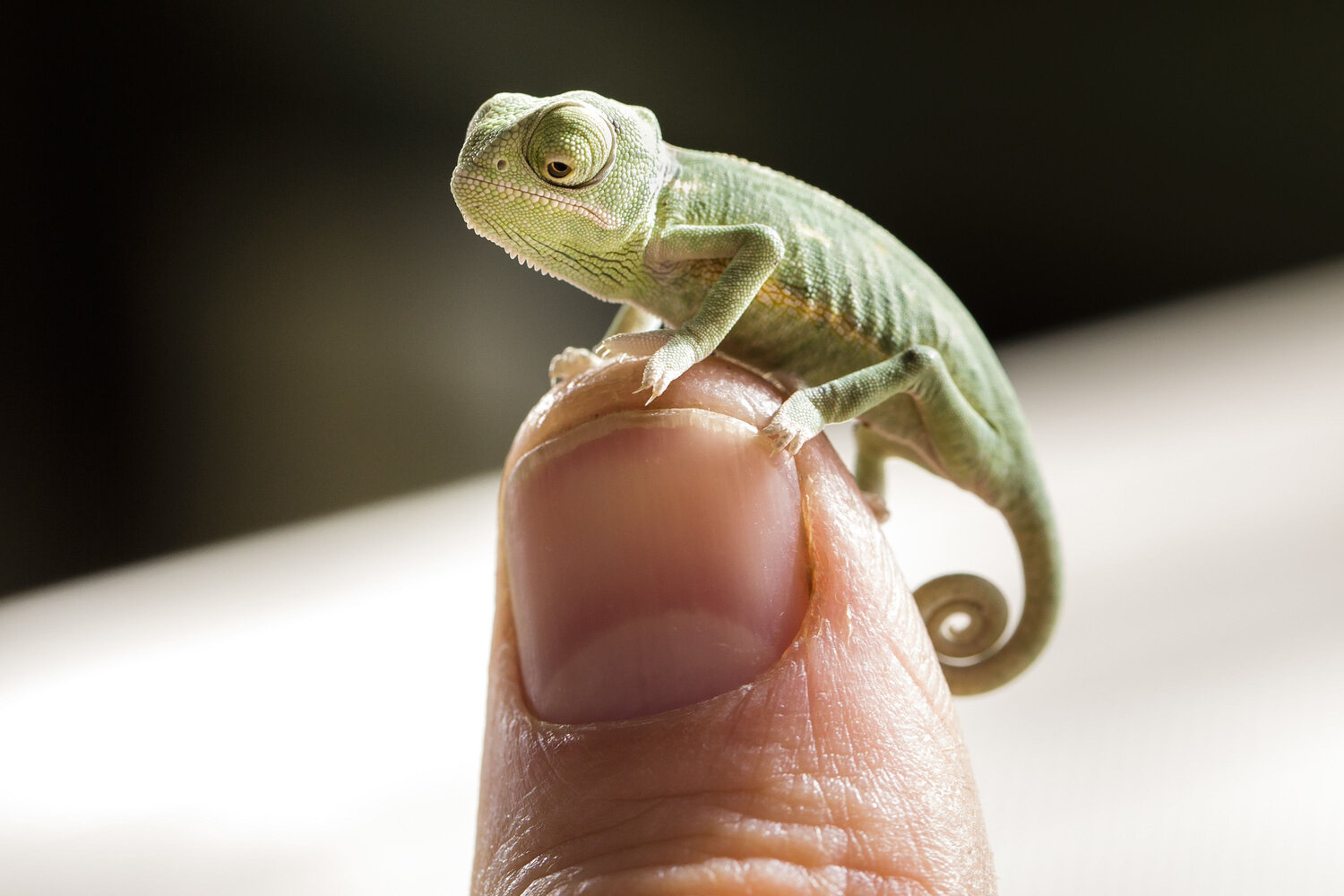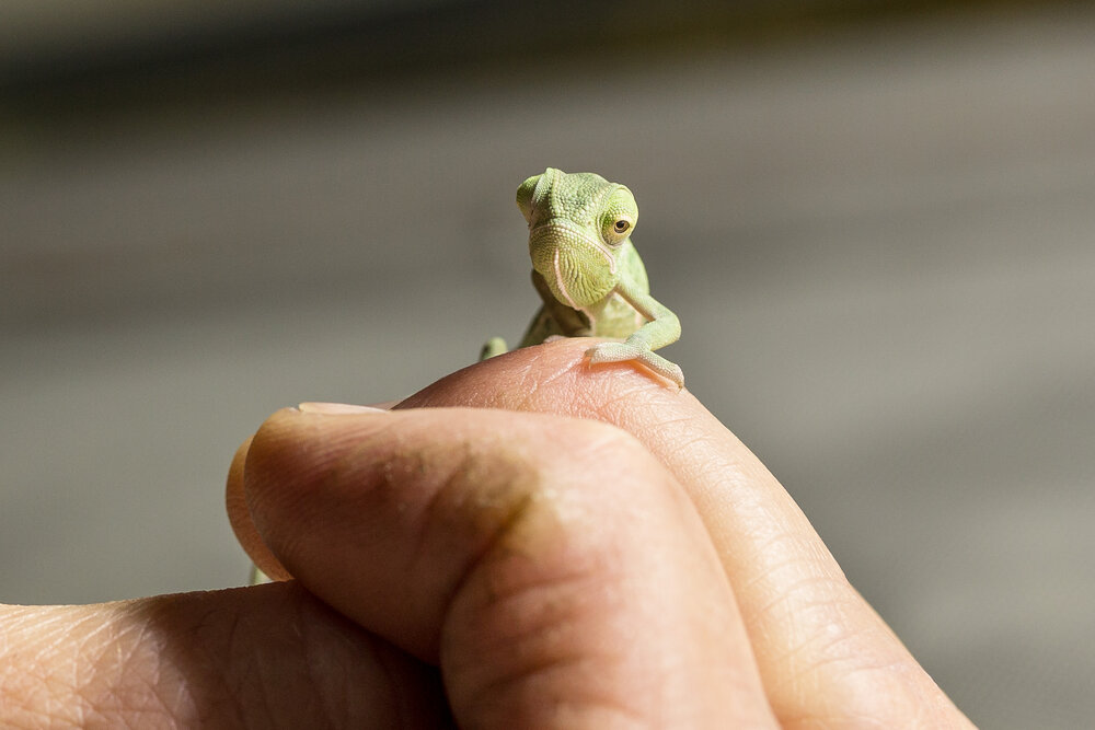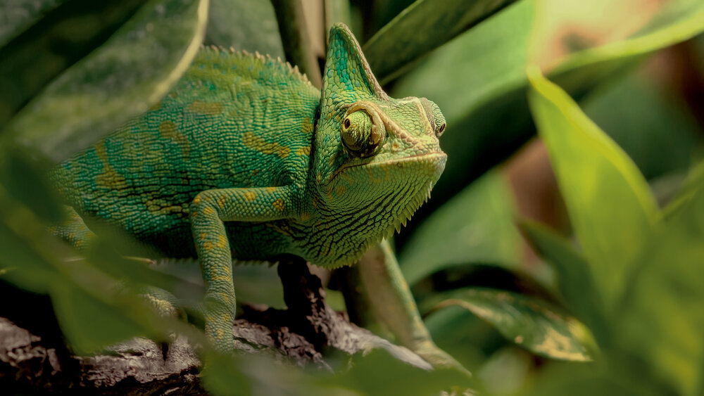 So it turns out that chameleons have four different layers of skin. The top layer, the epidermis, simply has a protective purpose. The bottom layer can only reflect the colour white. The exciting layers are the two in between. They contain highly specialised pigment-bearing cells known as iridophores. Within those cells are nanocrystals that reflect light, and it is these crystals that are responsible for the chameleons’ remarkable ability to change colour. The two middle layers of skin each play a different role in the transformation process. The second layer contains primarily yellow and red pigments while the third has dark pigments that create browns and blues. Within both layers, the nanocrystals are arranged in a lattice form. Researchers have learned that it is the spacing between the nanocrystals that determines the colour of the chameleon’s skin. If the reptile is relaxed, the crystals in its skin are close together and reflect short-wave blue light, which has to pass through the yellowish pigment in the next layer of skin. And as you will surely remember from primary school art lessons, blue plus yellow makes green – and that is why our chilled-out Yemen chameleons appear green.